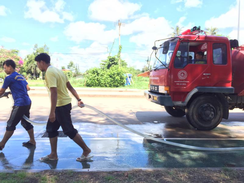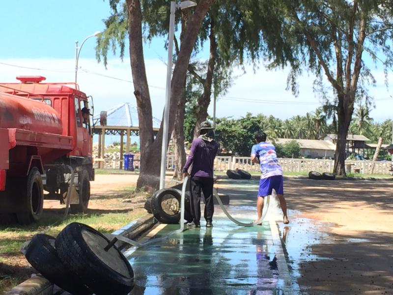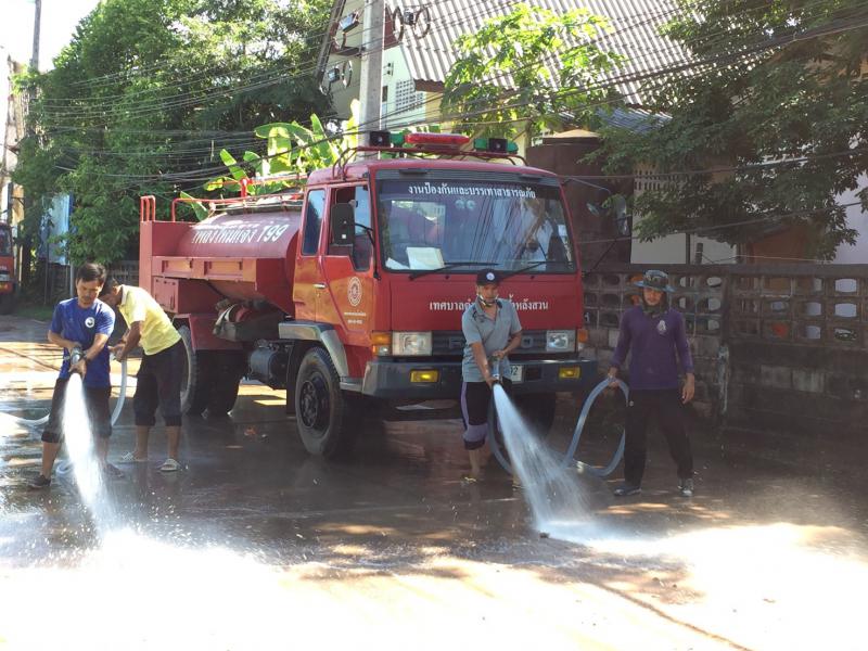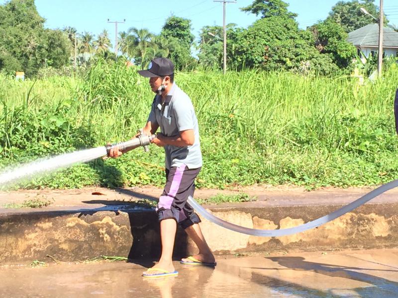 เทศบาลตำบลปากน้ำหลังสวน โดยงานป้องกันและบรรเทาสาธารณภัย กำลังดำเนินการฉีดล้างถนนเพื่อทำความสะอาด บริเวณหน้าวัดแหลมสน (5 ภาพ)