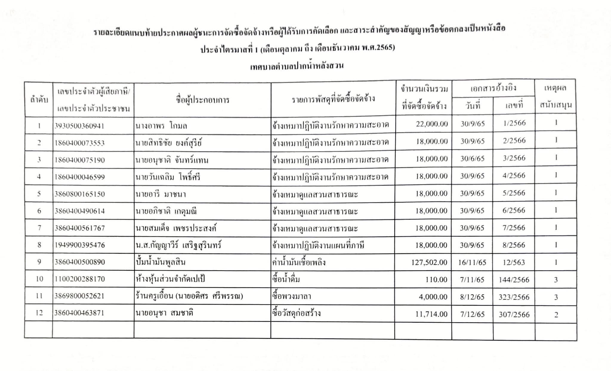 ประกาศเทศบาลตำบลปากน้ำหลังสวน เรื่องประกาศผลผู้ชนะการจัดซื้อจัดจ้างหรือผู้ได้รับการคัดเลือก และสาระสำคัญของสัญญาหรือข้อตกลงเป็นหนังสือ ประจำไตรมาสที่ 1 (เดือนตุลาคม พ.ศ.2565 ถึง เดือนธันวาคม พ.ศ.2565)
