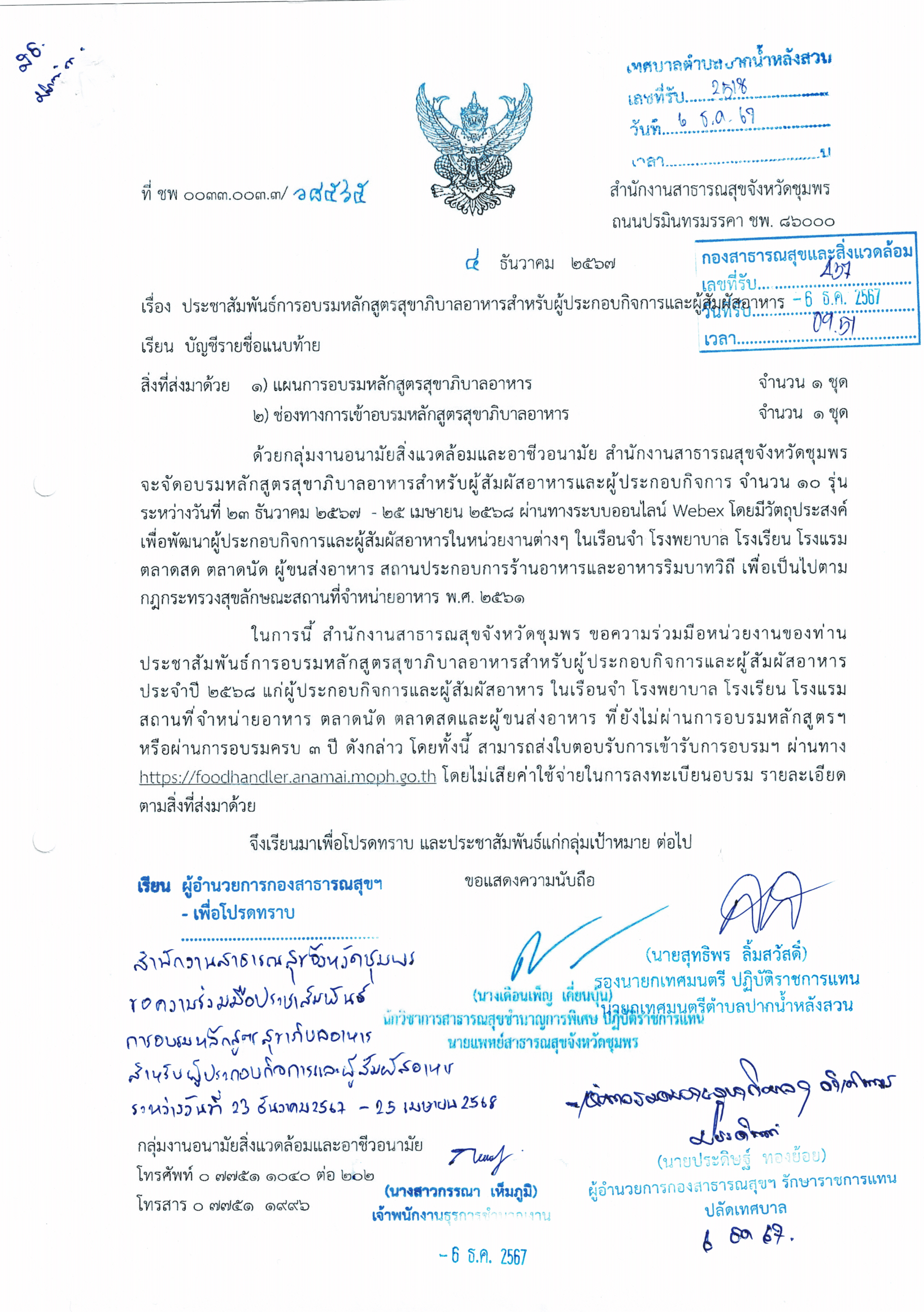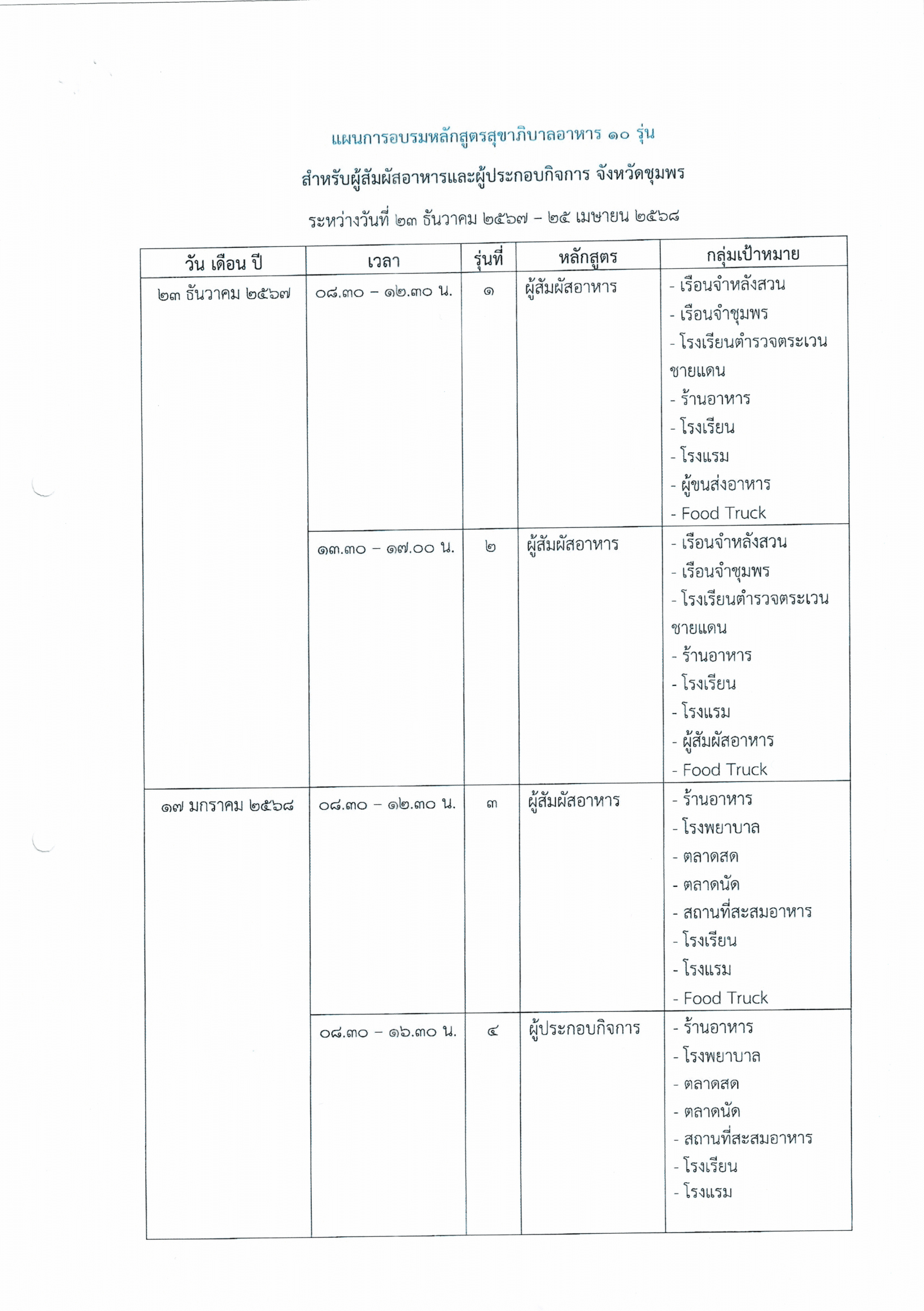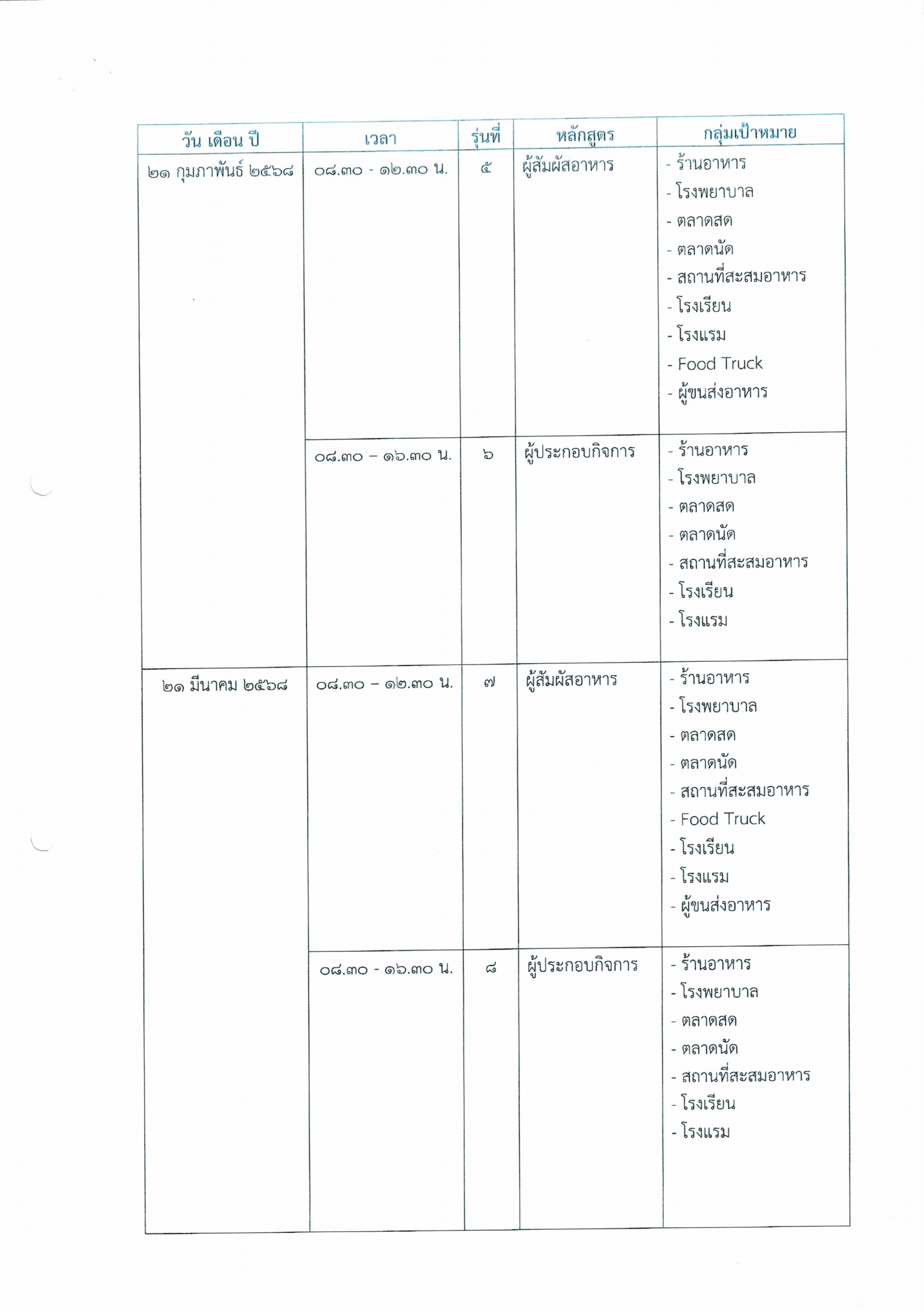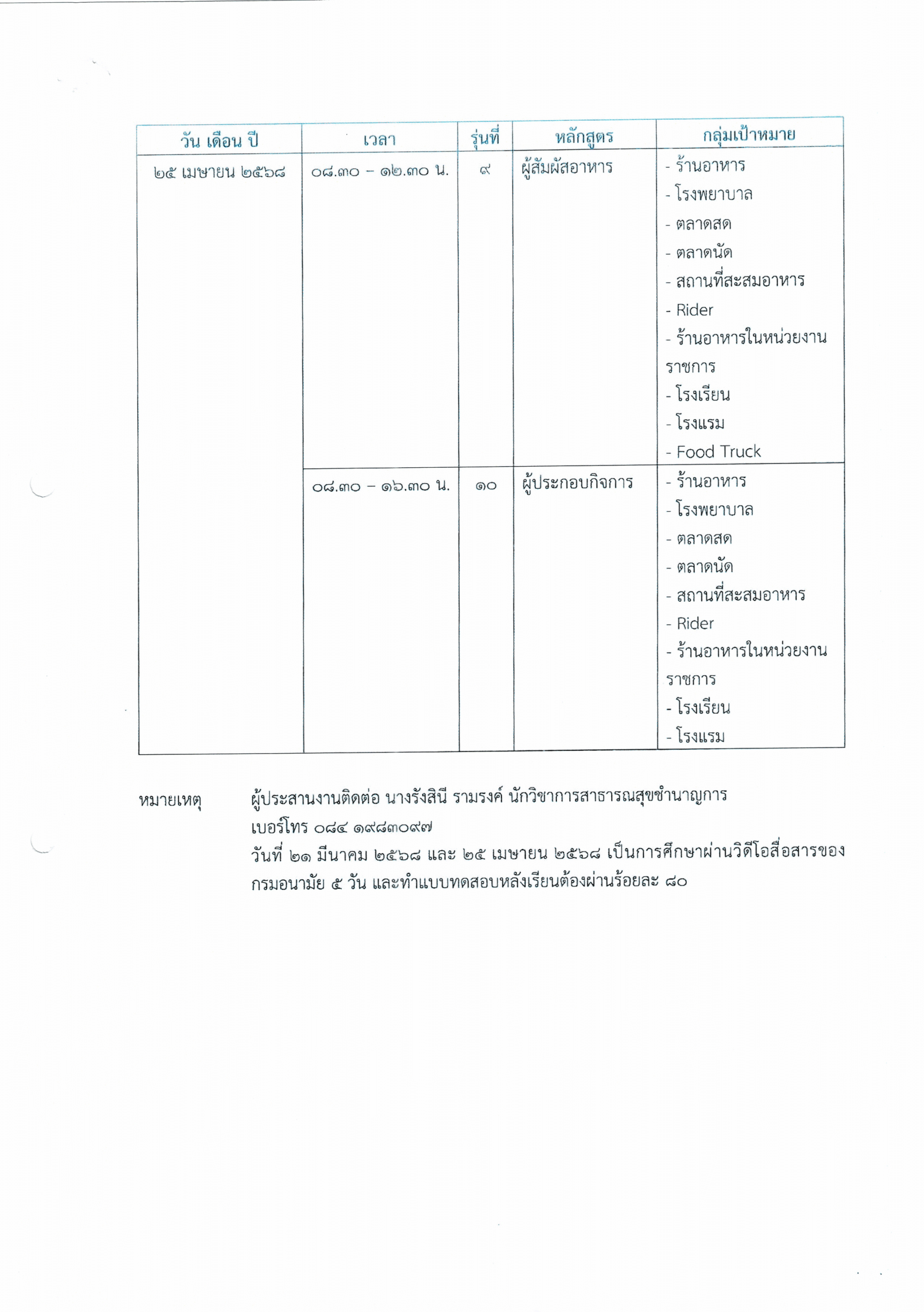 ประชาสัมพันธ์การอบรมหลักสูตรสุขาภิบาลอาหารสำรับผู้ประกอบกิจการและผู้สัมผัสอาหาร
