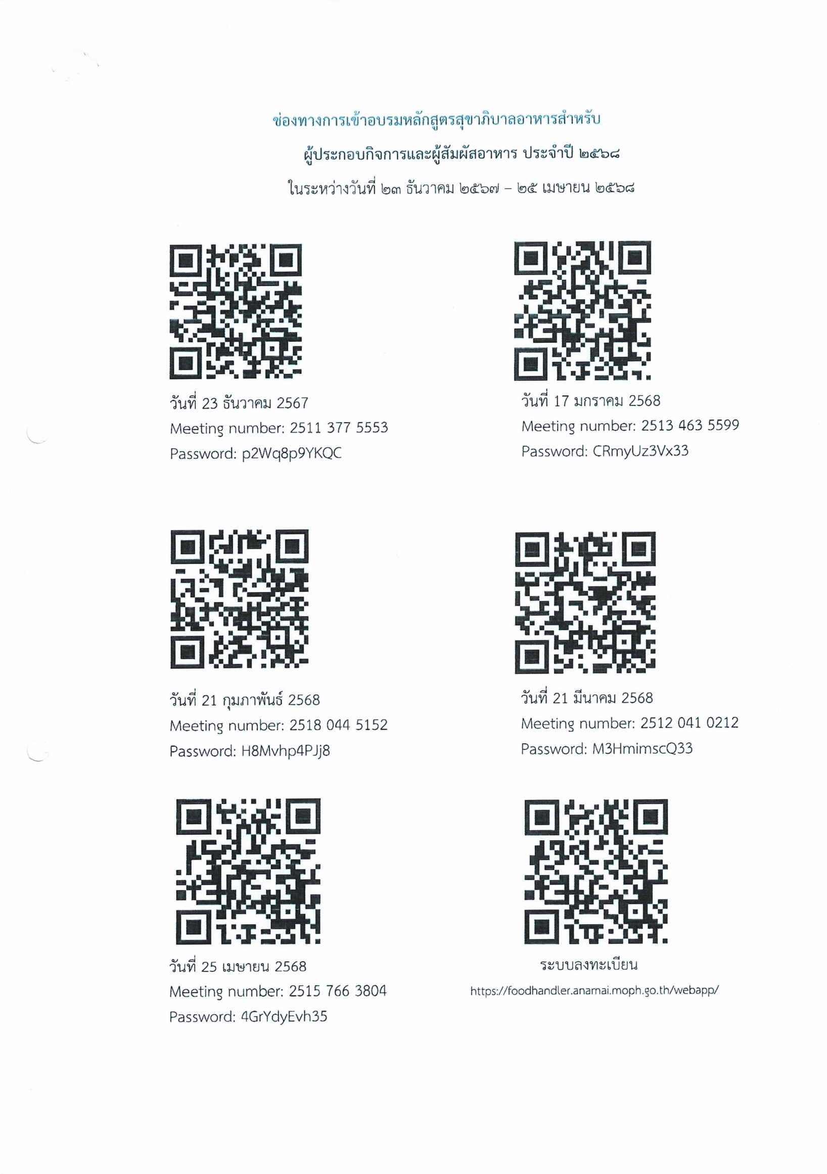 ประชาสัมพันธ์การอบรมหลักสูตรสุขาภิบาลอาหารสำรับผู้ประกอบกิจการและผู้สัมผัสอาหาร สมัครเข้าร่วมอบรมได้ที่ : https://foodhandler.anamai.moph.go.th/webapp/