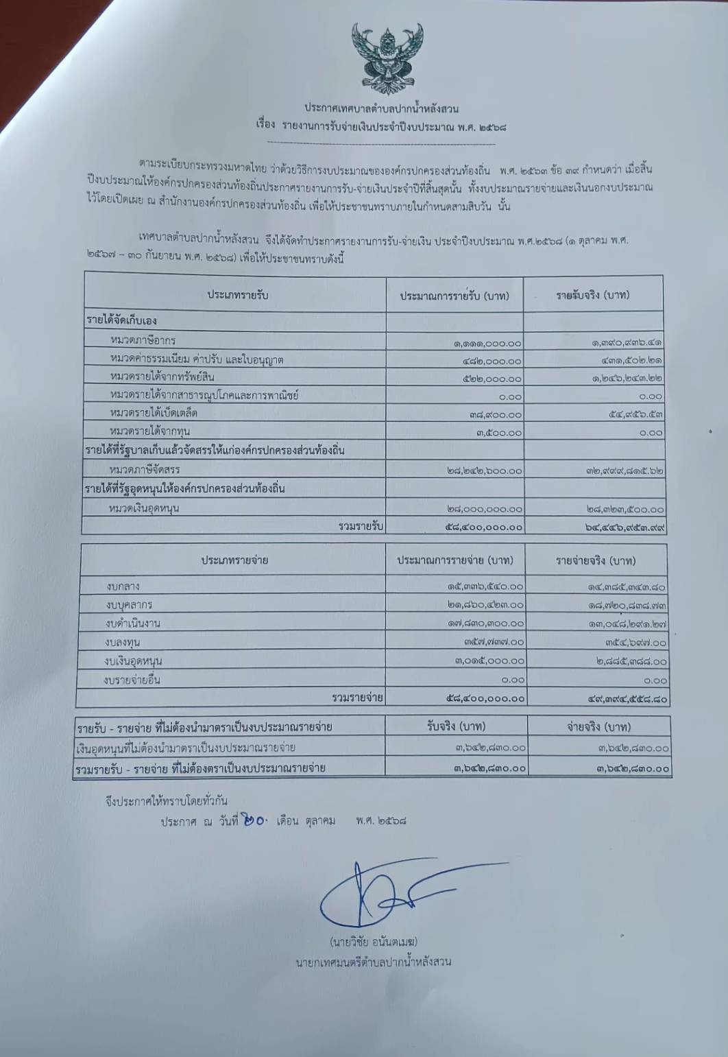 ประกาศเทศบาลตำบลปากน้ำหลังสวน เรื่อง รายงานการรับจ่ายเงินประจำปีงบประมาณ พ.ศ. 2568