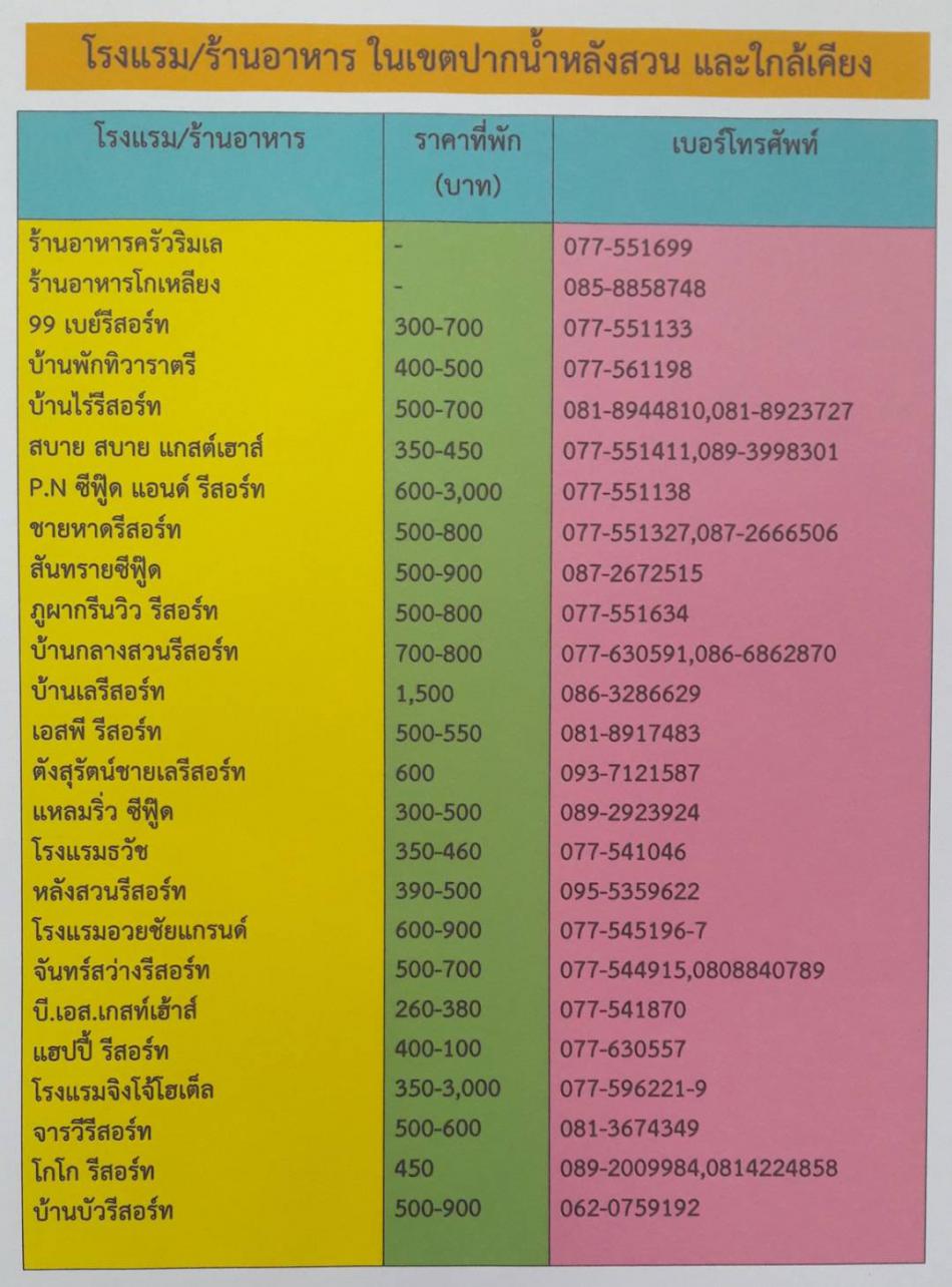 โรงแรม/ร้านอาหารในเขตตำบลปากน้ำหลังสวน และใกล้เคียง [12 มีนาคม 2562]