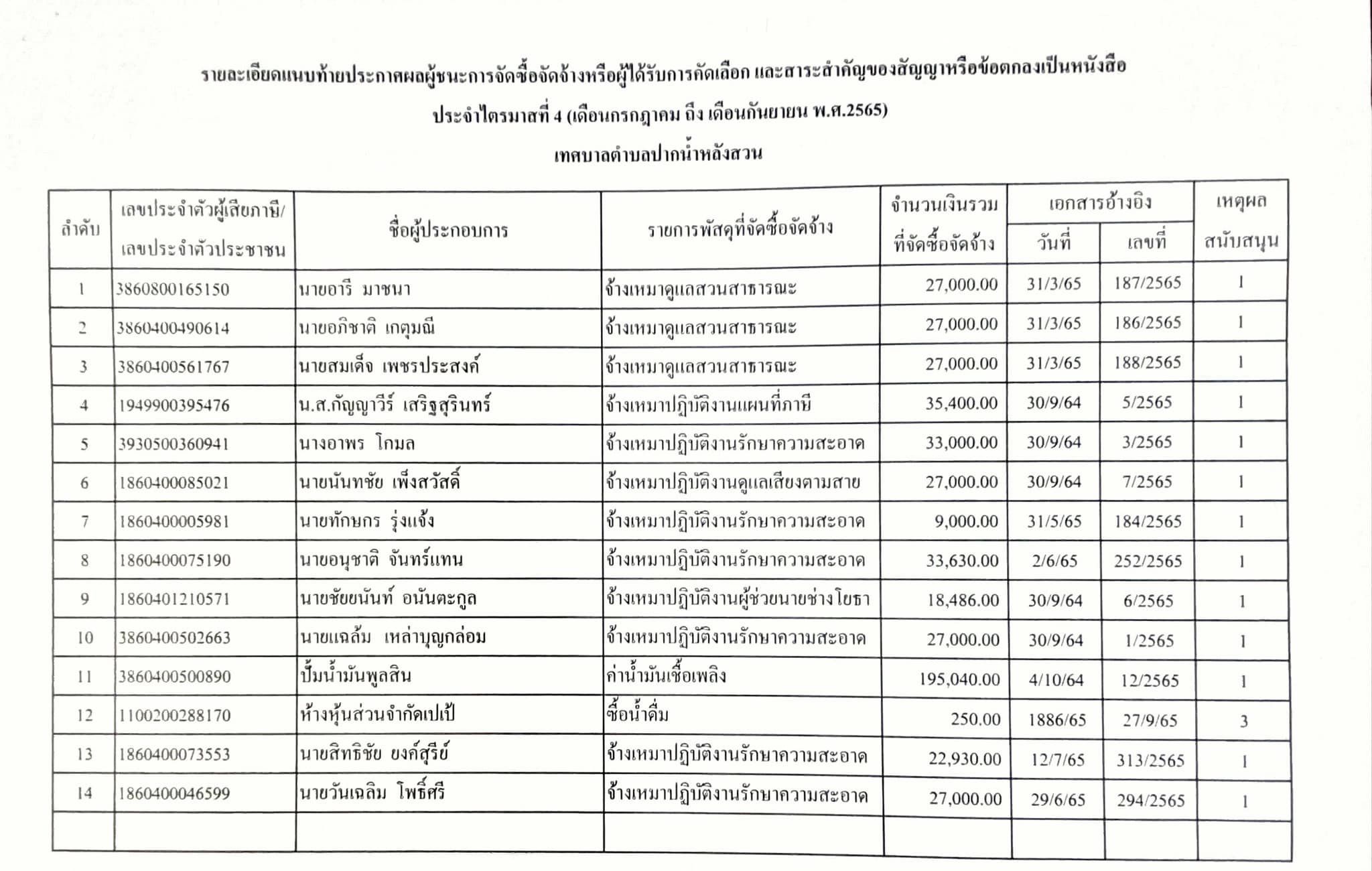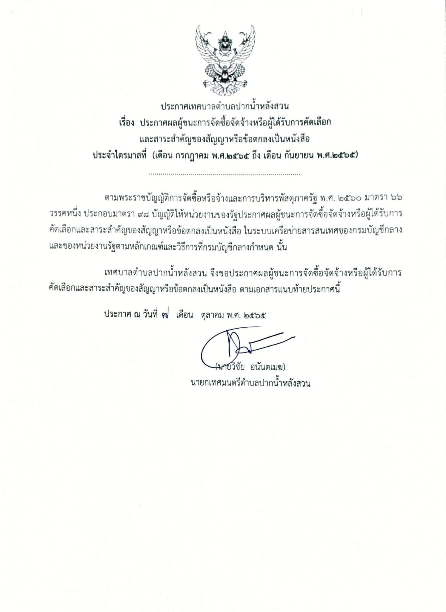 ประกาศเทศบาลตำบลปากน้ำหลังสวน เรื่องประกาศผลผู้ชนะการจัดซื้อจัดจ้างหรือผู้ได้รับการคัดเลือก และสาระสำคัญของสัญญาหรือข้อตกลงเป็นหนังสือ ประจำไตรมาสที่ (เดือนกรกฎาคม พ.ศ.2565 ถึง เดือนกันยายน พ.ศ.2565))
