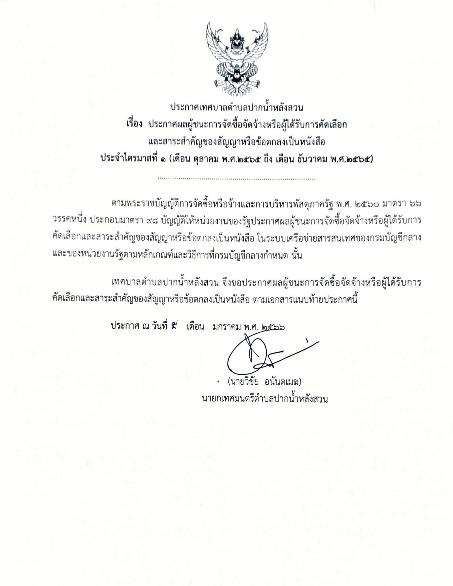 ประกาศเทศบาลตำบลปากน้ำหลังสวน เรื่องประกาศผลผู้ชนะการจัดซื้อจัดจ้างหรือผู้ได้รับการคัดเลือก และสาระสำคัญของสัญญาหรือข้อตกลงเป็นหนังสือ ประจำไตรมาสที่ 1 (เดือนตุลาคม พ.ศ.2565 ถึง เดือนธันวาคม พ.ศ.2565)